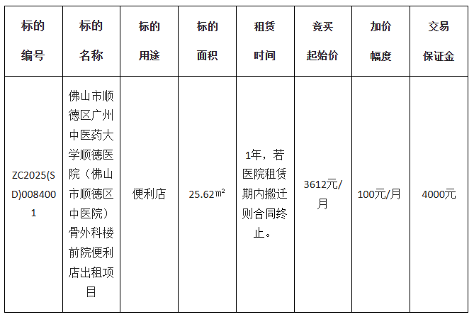 广州中医药大学顺德医院(佛山市顺德区中医院)采用网上竞价方式出租位于佛山市顺德区大良街道金沙大道12号骨外科楼前院便利店经营权,欢迎符合资格的竞买人参与竞价。