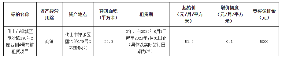 2.佛山市公共资源交易中心南海分中心通过佛山市资产交易网上交易系统及粤公平网站发布的项目信息(包括但不限于公告信息、交易文件、合同条款等)并不构成佛山市公共资源交易中心南海分中心对项目的任何交易建议。意向竞买人应不依赖于已披露的项目信息并自行对项目的相关情况进行必要的尽职调查和充分了解,对是否竞买该项目及项目成交后可能发生的费用和存在的风险自行作出充分评估,并独立承担所有风险。意向竞买人一经申请参加竞买,即视为知晓、认可项目现状,佛山市公共资源交易中心南海分中心对此不承担任何法律责任。