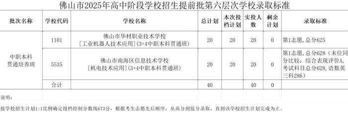 2025年佛山市高中阶段学校招生提前批录取控制分数线及学校录取标准如下。预计考生可在7月20日晚登录中考信息管理系统查询录取结果。