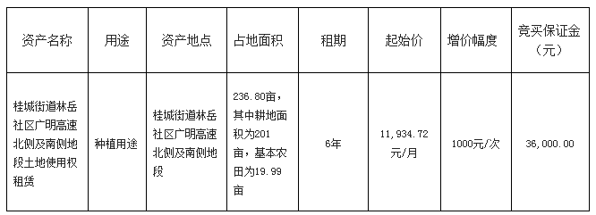 5.租金收取方式:租赁期内,第1-3年为土壤改良复耕期,免收取租金(不计入租金递增时间);第4-6年为支持项目发展期,按成交年租金标准50%计收租金,第7年起按成交年租金单价计收租金。租金采用先交付后使用的方式,竞得人按年缴交租金,具体缴交时间按《租赁物移交确认书》约定为准。租赁期内,租金从租期第4年起每满五年在上一期租金基础上递增10%。竞得人须在签订《租赁合同书》之日起10个工作日内缴交合同保证金,合同保证金按交易成交价初始租金计算的3个月租金计收。