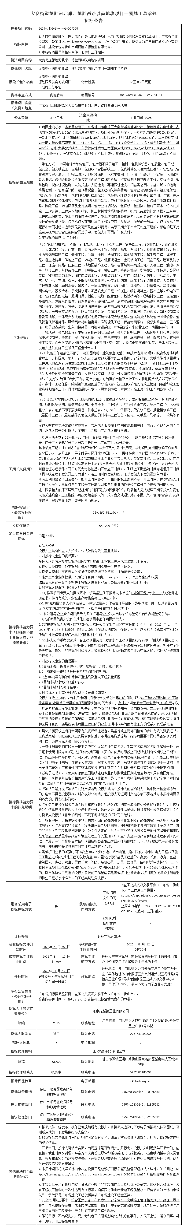 顺德大良街道德胜河北岸、德胜西路以南地块项目一期施工总承包招标公告