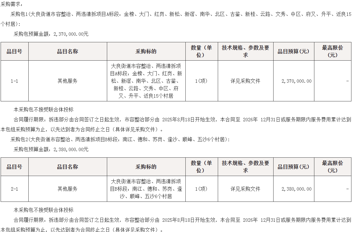 大良街道市容整治、两违清拆项目招标项目的潜在投标人应在广东省政府采购网https://gdgpo.czt.gd.gov.cn/获取招标文件,并于 2025年08月12日 09时30分 (北京时间)前递交投标文件。