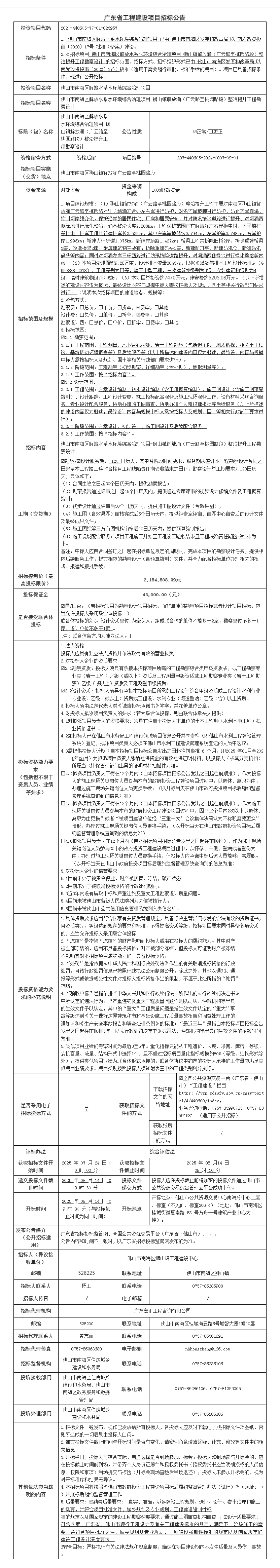 佛山市南海区解放水系水环境综合治理项目-狮山镇虎头坑涌分布式活水项目勘察设计招标公告