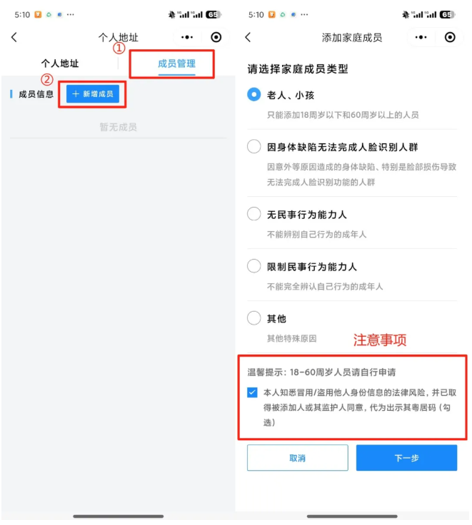在“粤居码”首页进入【个人地址】界面,点击【成员管理】,即可新增同住成员信息。