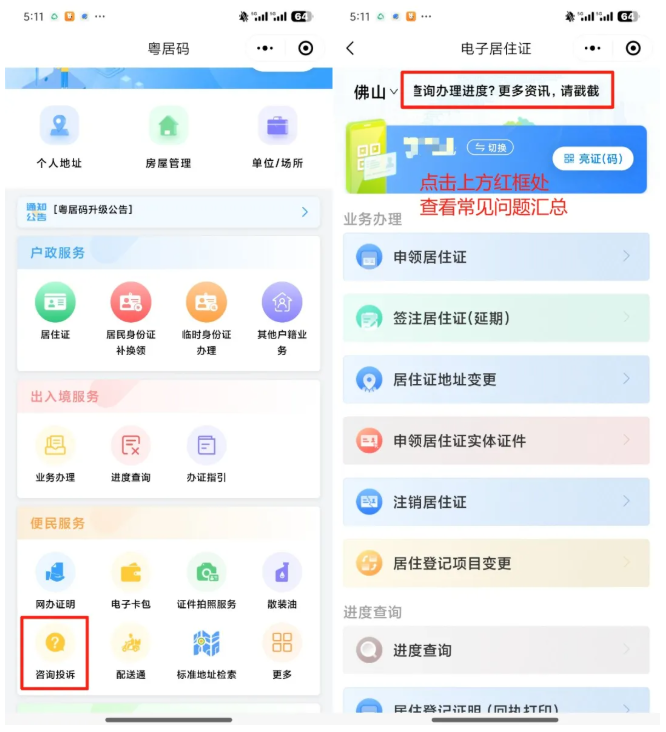 方式一:在“粤居码”微信小程序首页点击【咨询投诉】,查看“粤居码”使用中的【常见问题】。