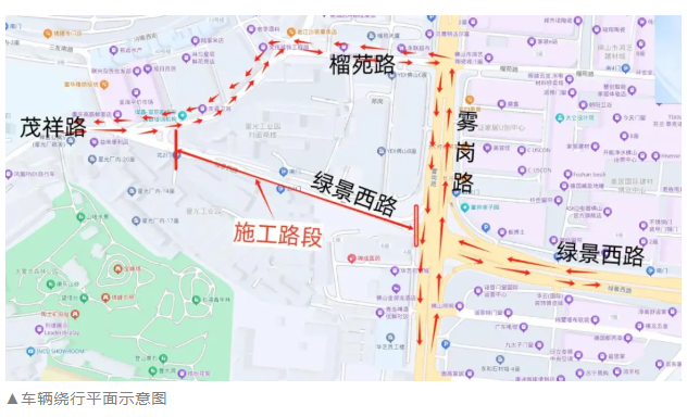 2025年7月30日零时起至2025年8月13日22时,绿景西路(金海平价市场至雾岗路段)围蔽施工,该施工对机动车通行有影响,届时机动车需利用以下路段进行绕行:茂祥路、榴苑路、雾岗路、绿景西路(下文附有绕行示意图);非机动车可利用绿景路西北侧人行道通行。