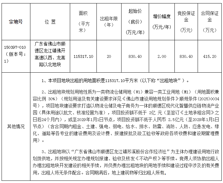 受佛山市顺德区龙江镇人民政府委托,佛山市顺德区公共资源交易中心(以下称“挂牌人”)以网上挂牌方式出租广东省佛山市顺德区龙江镇苏溪股份合作经济社(以下称“出租人”)的国有建设用地使用权[交易编号为TD2025(SD)WG0031]。现将有关事项公告如下: