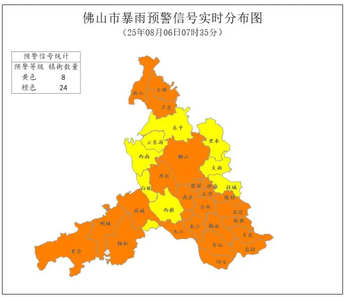 截至8月6日上午7:35,禅城区,顺德区,高明区,南海九江、丹灶、狮山,三水大塘、芦苞、南山暴雨橙色预警信号,全市其余镇街暴雨黄色预警信号,顺德区雷雨大风黄色预警信号正在生效。预计今天白天佛山市仍有明显降雨过程,伴有雷电、短时强降水等强对流天气,展望7日降雨减弱,午后仍有雷雨风险。近期佛山降雨频繁,土壤含水量高,地质灾害具有滞后性,请继续做好相关防御。