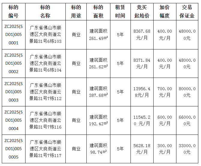佛山市顺德区大良德良物业管理公司采用网上竞价方式出租位于佛山市顺德区大良街道云景路31号6栋103等5宗物业,欢迎符合资格的竞买人参与竞价。