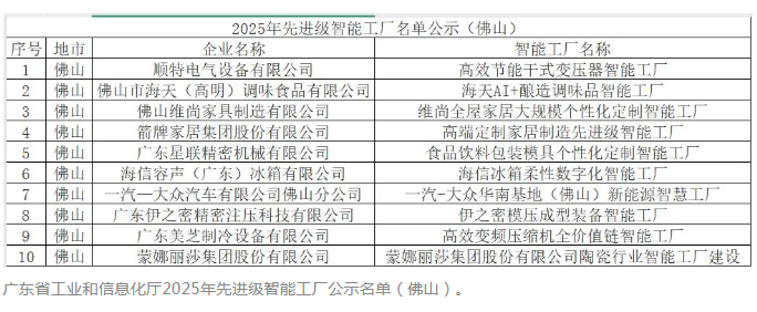 近日,广东省工业和信息化厅公示了《2025年先进级智能工厂名单》,全省90家企业上榜,覆盖13个地市。其中,佛山共有10家企业拟入选。先进级智能工厂的标准要求聚焦数字化转型、网络化协同开展建设,打造区域行业领先的发展标杆。