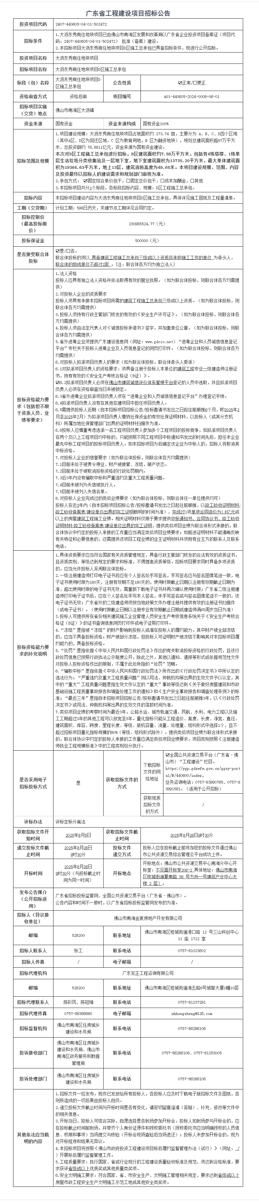 南海大沥东秀商住地块项目D区施工总承包招标公告