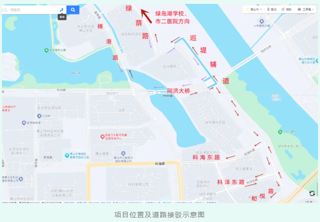 巡堤辅道的通车完善了南庄绿岛湖南北片区路网,将有效缓解禅港路的交通压力,为片区居民提供畅通的交通环境。