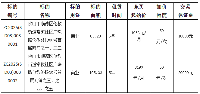 1.本项目的交易保证金为:佛山市顺德区伦教街道常教社区广珠路伦教路段30号首层商铺之一、之二人民币大写壹万元整(小写:¥10000);佛山市顺德区伦教街道常教社区广珠路伦教路段30号首层商铺之三、之四、之五人民币大写贰万元整(小写:¥20000)