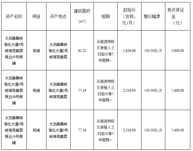 4.租赁物分两批移交,首批移交3项物业,第二批移交2项物业,各物业情况详见交易文件中《租赁合同书》附件1物业明细表,竞投人须自行承担由此产生的经营风险。首批移交租赁物的起始租金按成交价÷交易底价×首批移交租赁物交易底价计算,第二批移交租赁物的起始租金按成交价÷交易底价×第二批移交租赁物交易底价计算。