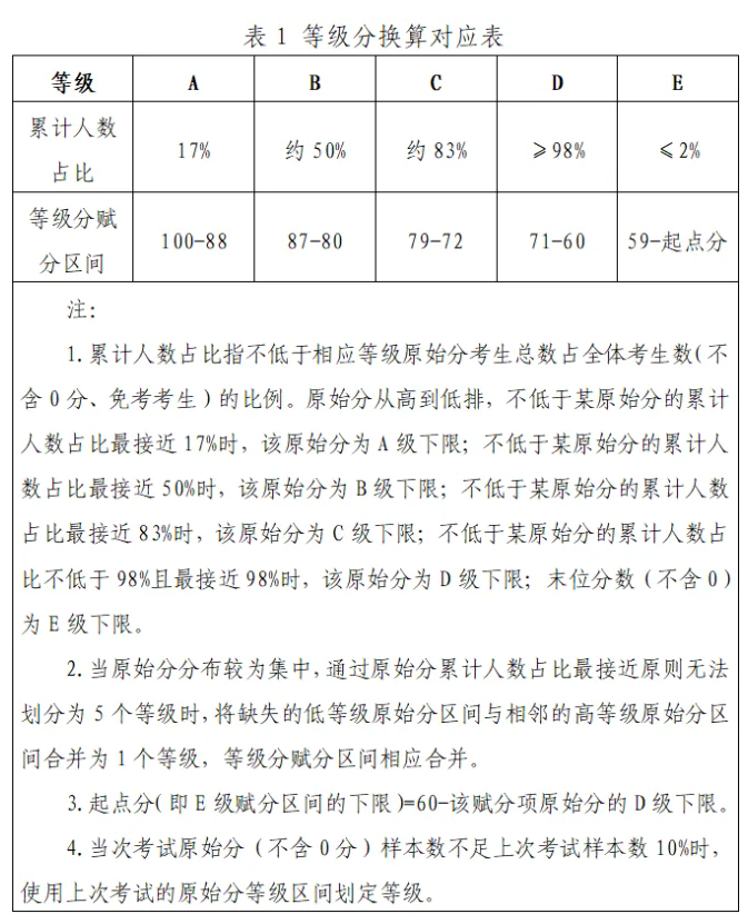 (四)等级分换算赋分。当某赋分项原始分60分(含)以上的考生占全体考生(不含0分、免考考生)的比例低于98%时,通过等级分换算得出该赋分项的赋分值,步骤如下。