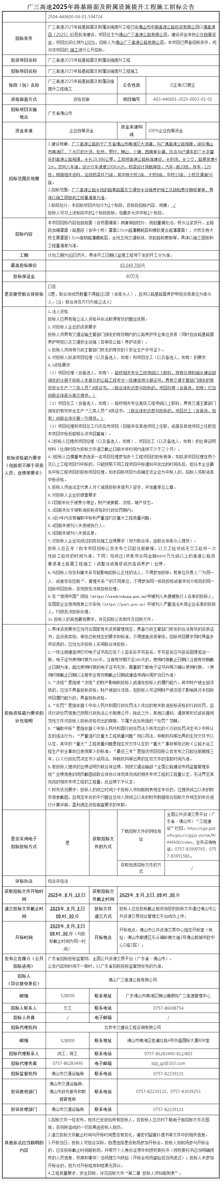 概述:广三高速2025年路基路面及附属设施提升工程已由佛山市中策高速公路投资有限公司以佛高速函〔2025〕45号批准建设,项目业主为佛山广三高速公路有限公司......