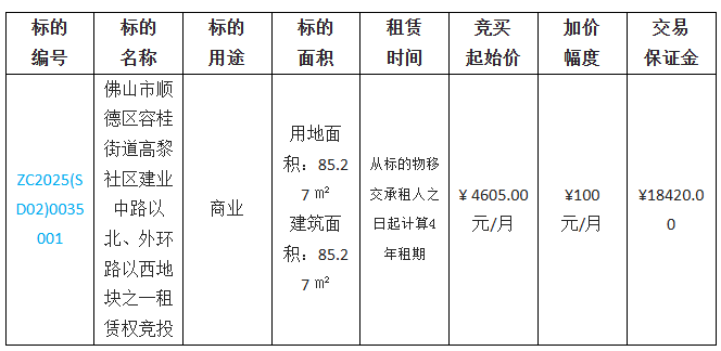 佛山市顺德区容桂街道高黎社区建业中路以北、外环路以西地块之四租赁权竞投