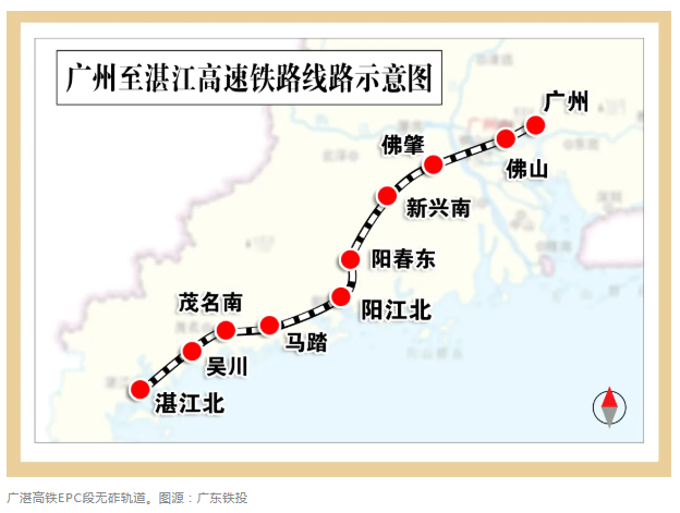 据悉,广湛高铁自广州站引出,向西经广东省佛山市、肇庆市、云浮市、阳江市、茂名市、湛江市,终至湛江北站,全长401公里,设计时速350公里。