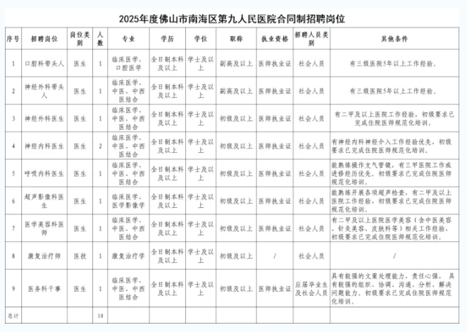 根据工作需要,佛山市南海区第九人民医院拟招聘合同制工作人员10名,具体岗位要求如下: