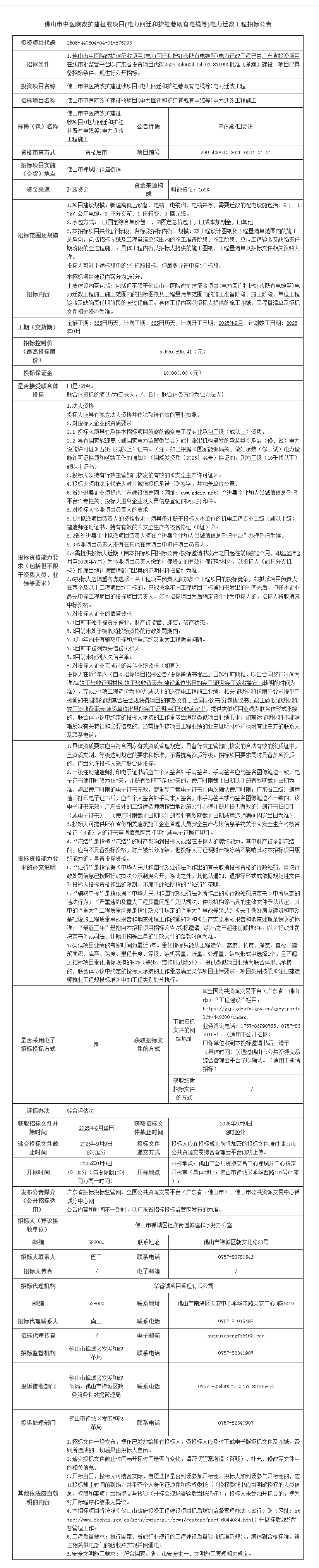 佛山市中医院改扩建征收项目(电力回迁和护红巷既有电缆等)电力迁改工程施工招标公告