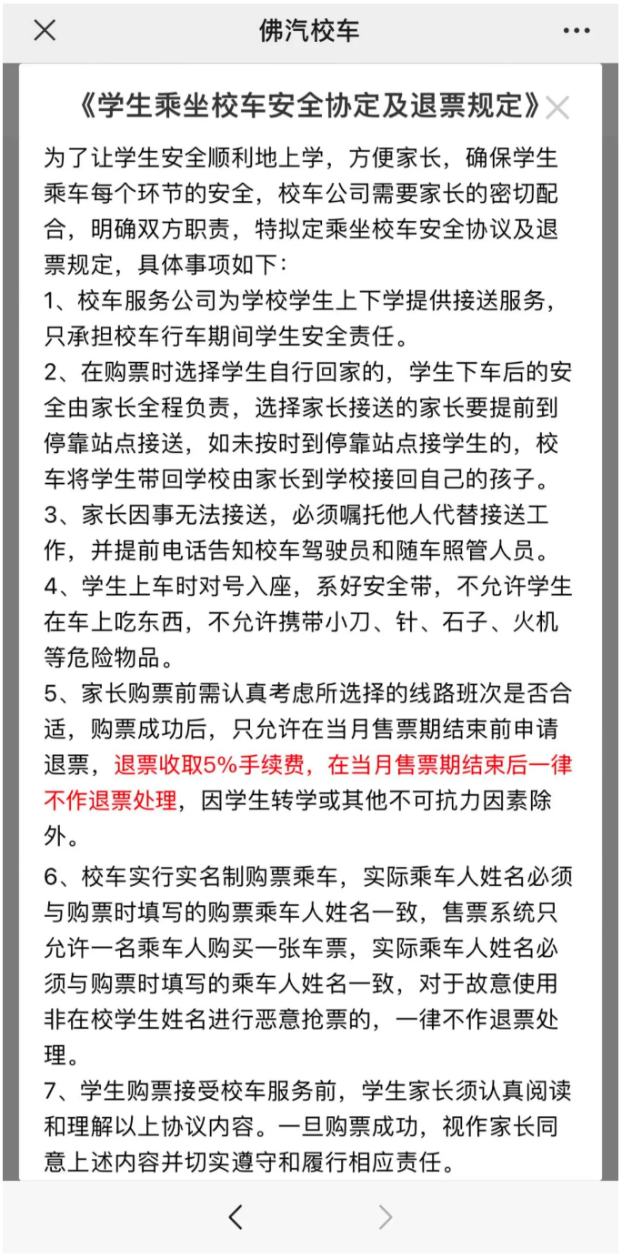 请家长在购票前认真阅读购票须知,并在支付前阅读并同意《学生乘坐校车安全协议书及退票规定》。