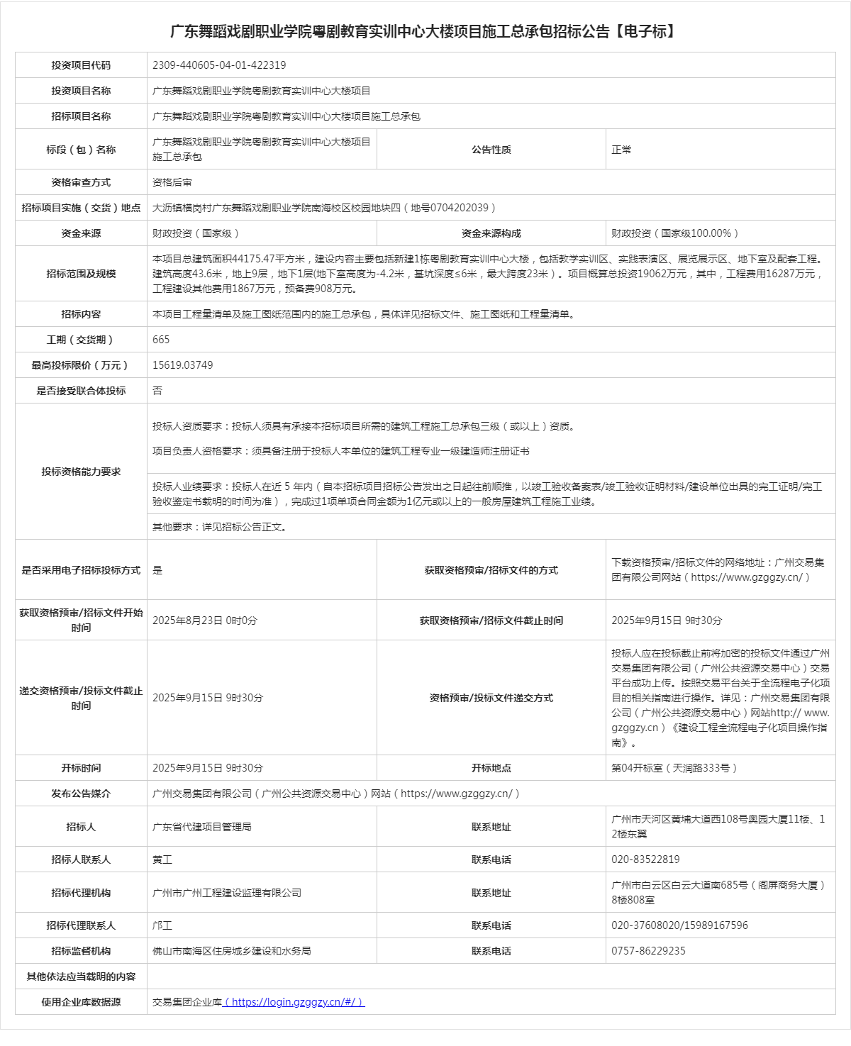 广东舞蹈戏剧职业学院粤剧教育实训中心大楼项目施工总承包招标公告