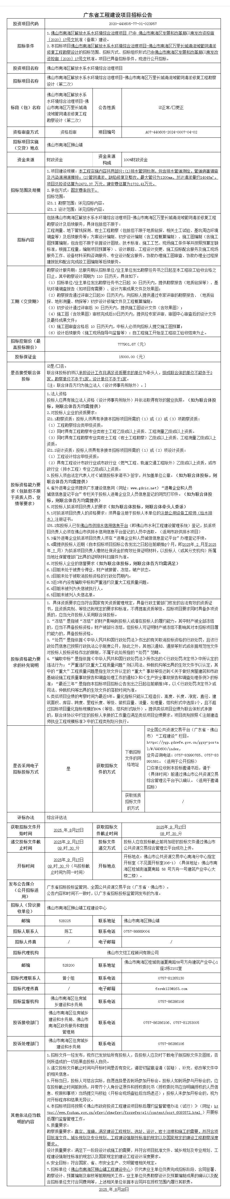 佛山市南海区解放水系水环境综合治理项目-佛山市南海区万里长城涌流域管网清淤修复工程勘察设计招标公告