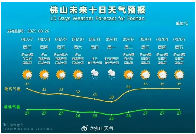 佛山市气象台预计,8月28日起受热带系统外围环流影响,有雷阵雨局部大雨,最高气温33℃。