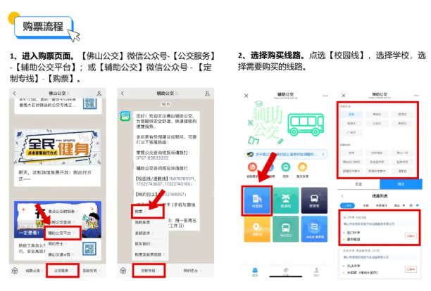 从【佛山公交】微信公众号—【公交服务】—【辅助公交平台】,或【辅助公交】微信公众号—【定制专线】—【购票】