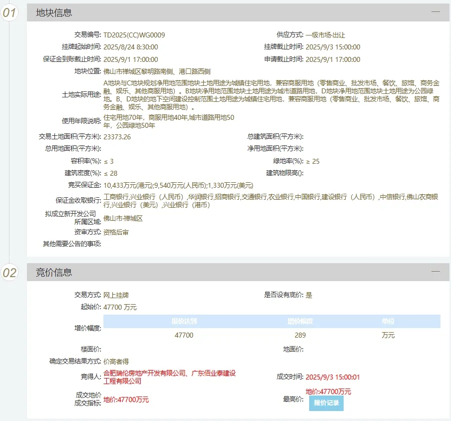 9月3日,港口路12号地块(以下简称“12号地块”)带着“现成红利+确定性价值+独家稀缺性”等一系列优势成功摘牌!合肥瑞伦房地产开发有限公司、广东佰业泰建设工程有限公司以47700万元竞得12号地块,地块规划净用地面积为23373.26平方米(约合35.06亩),折合楼面价约8000元/㎡。