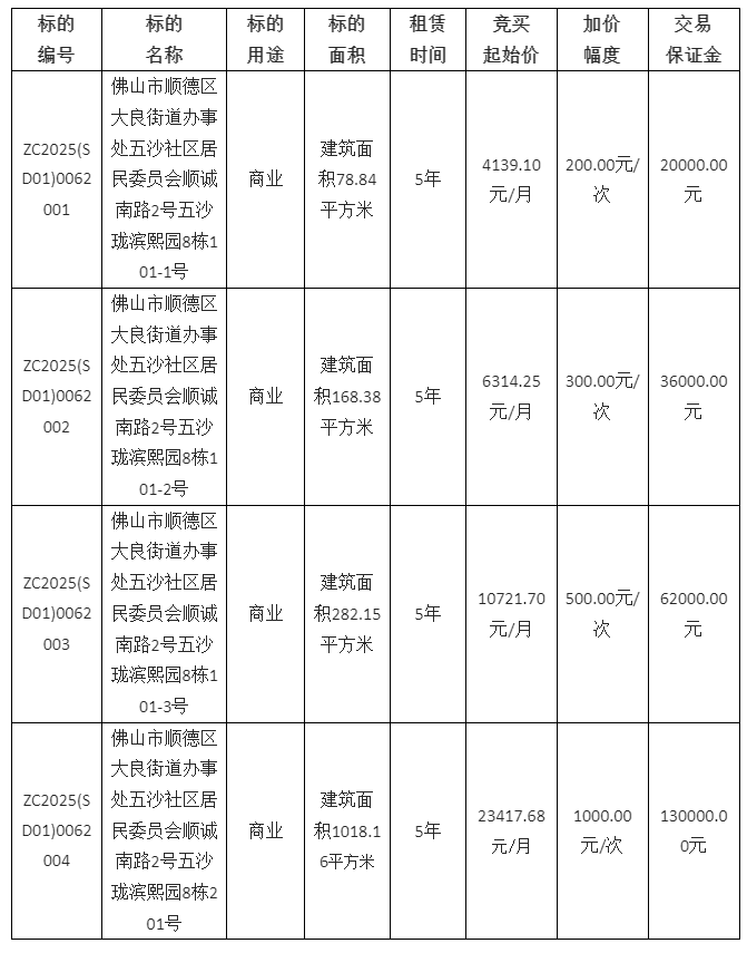 佛山市顺德区大良街道办事处五沙社区居民委员会顺诚南路2号五沙珑滨熙园8栋101-1号等4宗物业出租项目