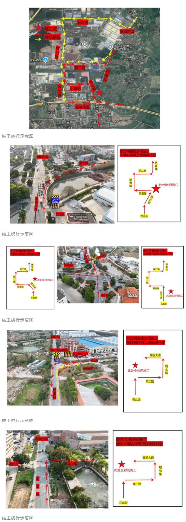 原经三和路西往东方向到高明城区、南海方向的车流可绕道行驶,向绕行路线如下: