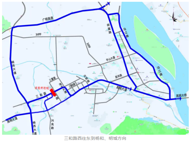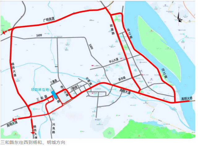 原经三和路东往西到杨和、明城方向的车流可绕道行驶,向绕行路线如下: