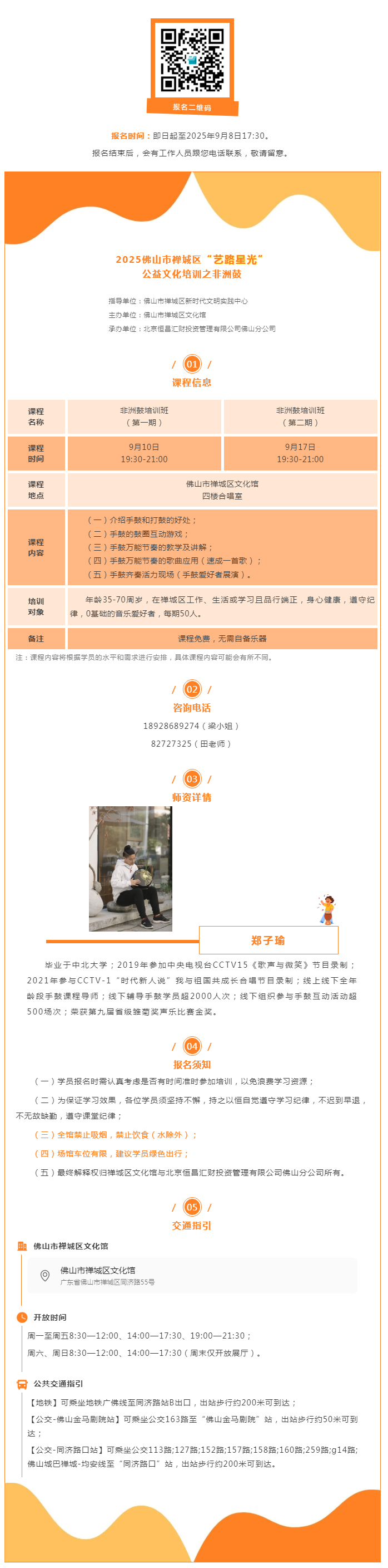 禅城区文化馆计划9月10日、17日举办2025佛山市禅城区“艺路星光”公益文化培训之非洲鼓课程,快来报名吧!让我们一起通过手鼓的练习,鼓声入心,得到身心的疗愈,提高音乐艺术的感知力。