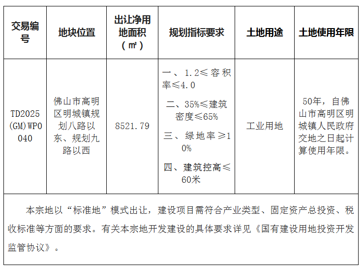 本块地其他规划建设要求按《高明区土地使用规划条件》(佛规明设函〔2025〕0065号)执行。