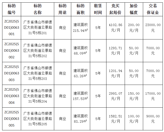 佛山市顺德区大良德良物业管理公司采用网上竞价方式出租位于佛山市顺德区大良街道云景路31号5栋201等5宗物业,欢迎符合资格的竞买人参与竞价。