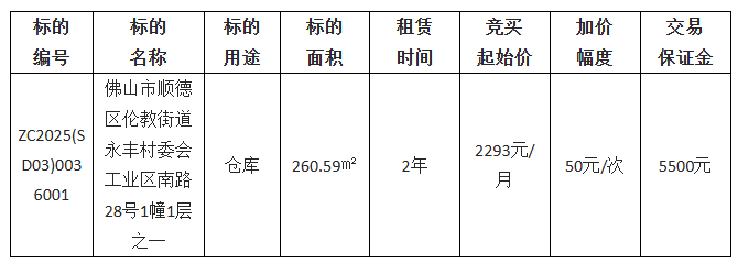 1.本项目的交易保证金为佛山市顺德区伦教街道永丰村委会工业区南路28号1幢1层之一物业的交易保证金为人民币大写伍仟伍佰元整(小写:¥5500)。