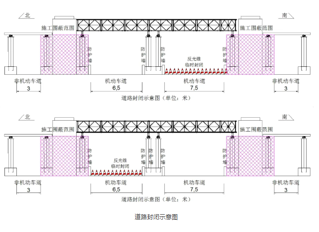 北面道路施工时,围蔽北面道路,早8:30-晚17:30围蔽东往西方向,借用西往东方向一车道行驶。