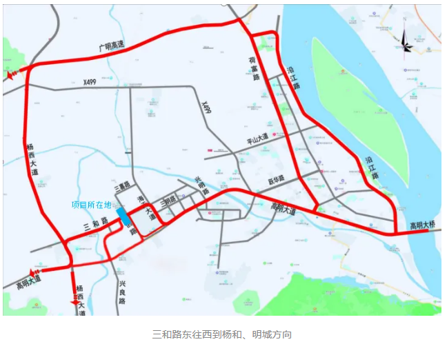 3.由高明大道开始→沿江路(中山路)→荷富路→广明高速→杨和、明城方向