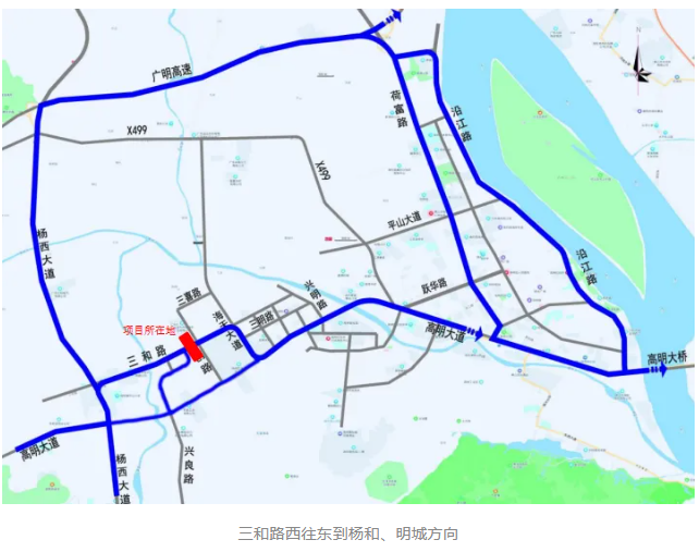 原经三和路东往西到杨和、明城方向的车流可绕道行驶,向绕行路线如下:
