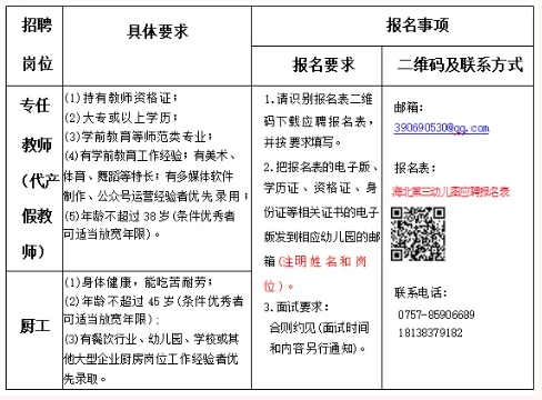 因园所发展需要,现计划向社会公开招聘幼儿园专任教师1名,代产假教师1名,厨工1名,具体招聘事项如下: