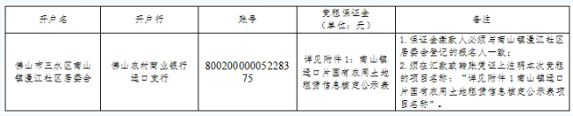 2.竞租保证金缴纳:报名时应缴纳竞租保证金,竞租保证金为年租金底价的25%,经南山镇漫江社区居委会审查符合竞租条件并报名登记成功的意向竞租者,于2025年9月18日17:00前将竞租保证金汇入佛山市三水区南山镇漫江社区居委会银行账户。