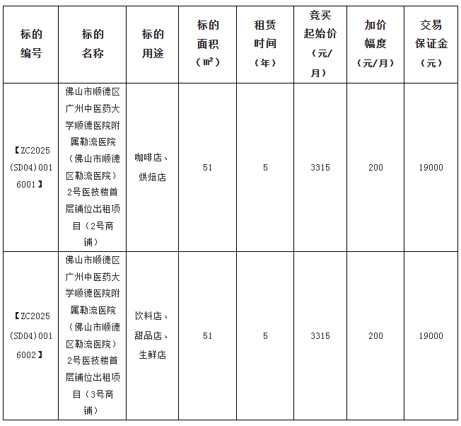 ①佛山市顺德区广州中医药大学顺德医院附属勒流医院(佛山市顺德区勒流医院)2号医技楼首层铺位出租项目(2号商铺),交易保证金为人民币(大写)壹万玖仟元整(小写:¥19000.00元);