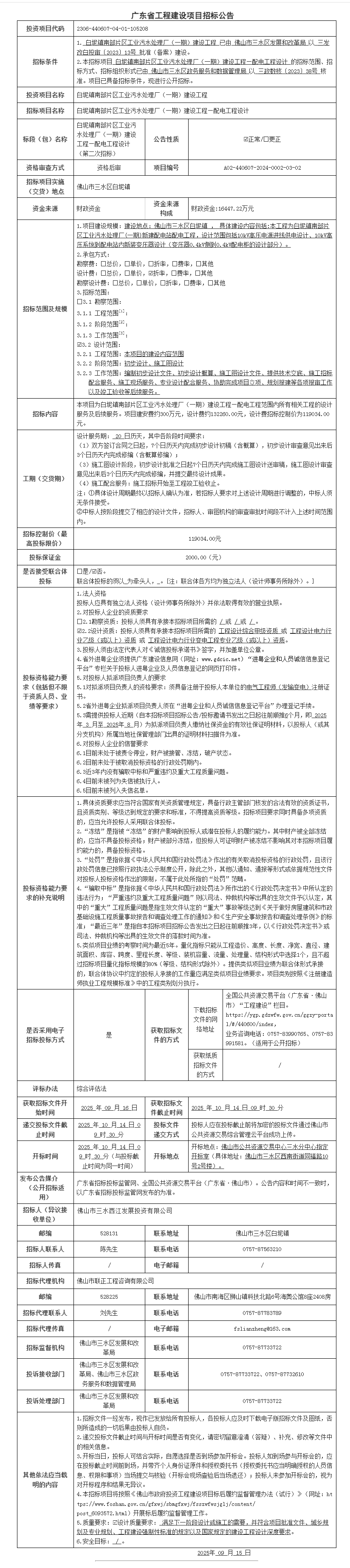 三水白坭镇南部片区工业污水处理厂(一期)建设工程—配电工程设计招标公告