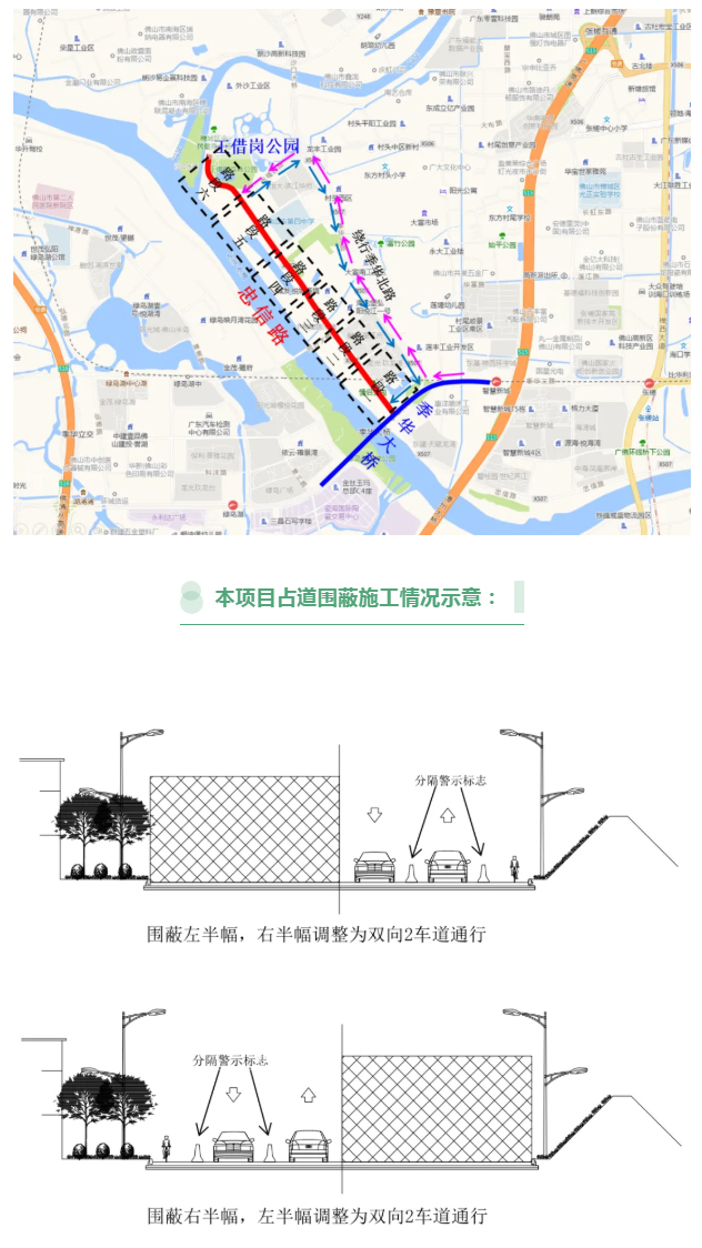 占道路段:分段占道忠信路(季华大桥至王借岗公园)。