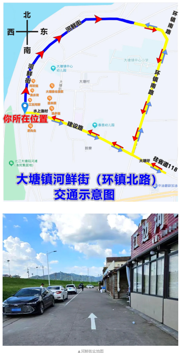 大塘镇河鲜街(大塘村防汛路、环镇北路),建设路口至大塘街路口段,实施由南往北单向通行;禁止该路段的车辆由北往南行驶。