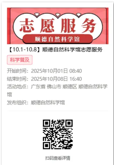 有意向报名的志愿者请扫描报名二维码,选择服务时间段。如报名有疑问,可致电顺德自然科学馆0757-22390260进行咨询。