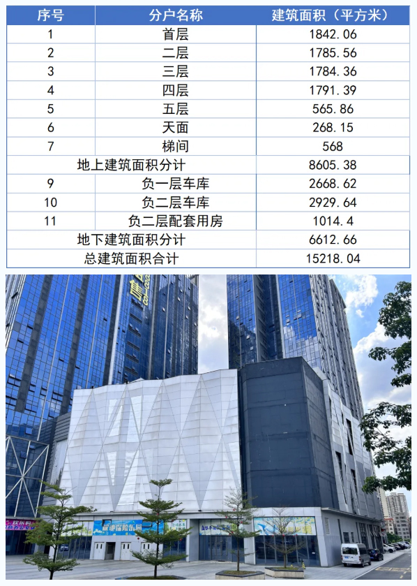 3号楼位于宇能数码广场B区,由地上5层、地下2层组成,总建筑面积15218.04平方米,其中地上建筑面积8605.38平方米,地下建筑面积6612.66平方米,包括地下停车位共117个,各楼层建设明细情况如下表所示。