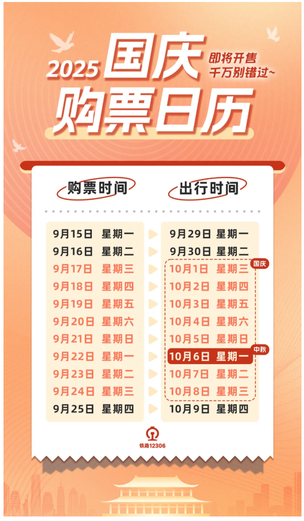 2025年国庆、中秋假期即将到来,从10月1日到10月8日共8天,假期列车票于今日(9月17日)开始发售。