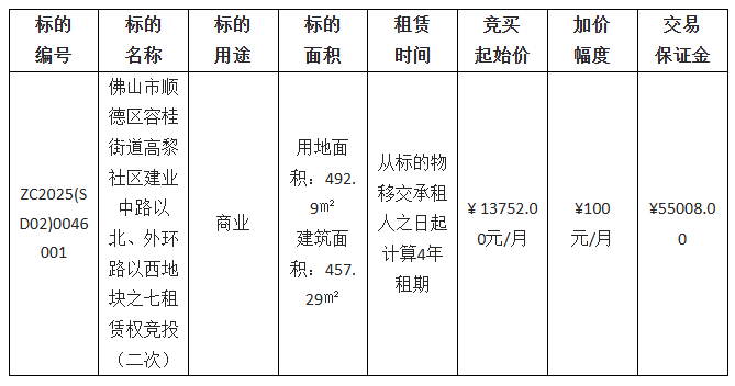 出租方采用网上竞价方式出租位于佛山市顺德区容桂街道高黎社区建业中路以北、外环路以西地块之七租赁权竞投(二次),欢迎符合资格的竞买人参与竞价。